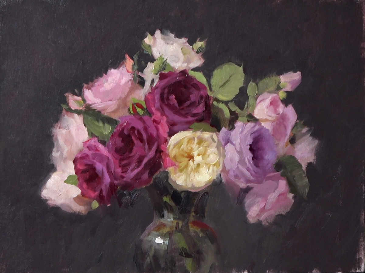 In this lesson we paint a variety of roses. I painted mine on a 12 x 16 Centurian universal primed linen. This universal primed linen is an acrylic priming so the paint sucks in a bit more than in an oil ground linen. I did add Quinacridone Red and Quinacridone Violet to my palette.